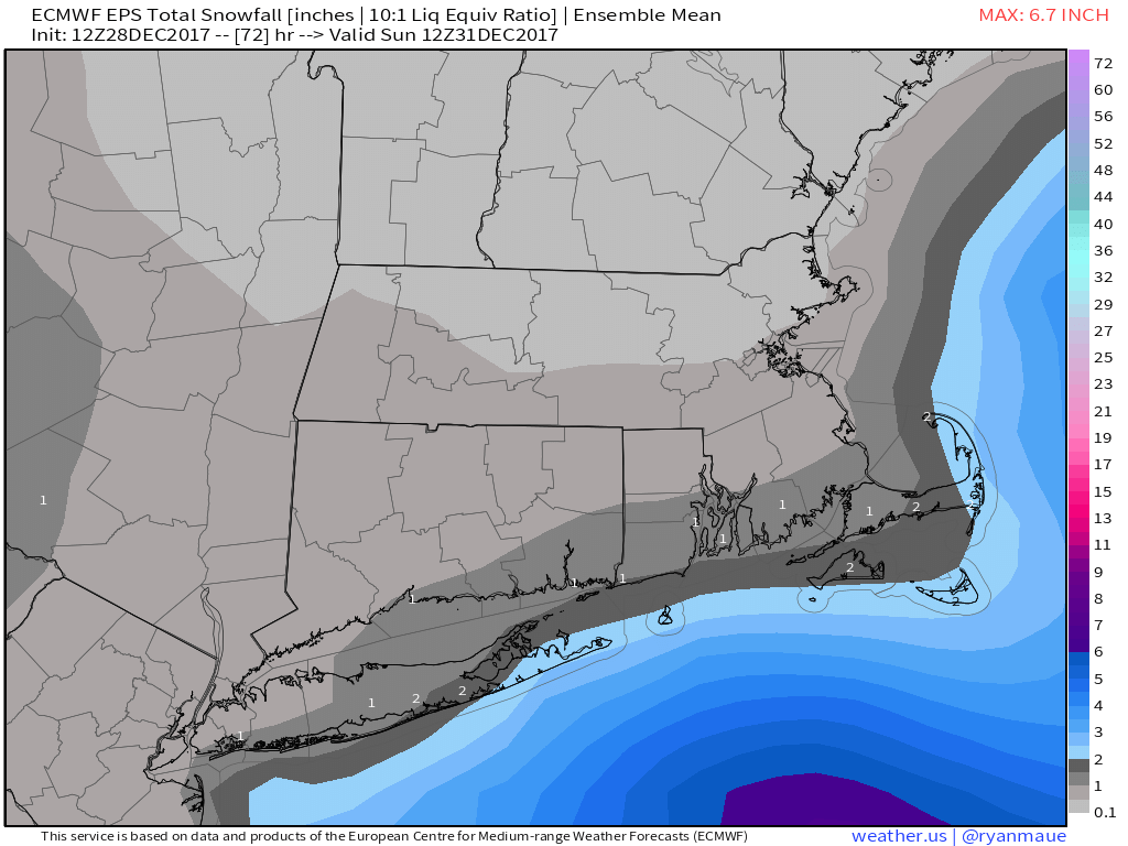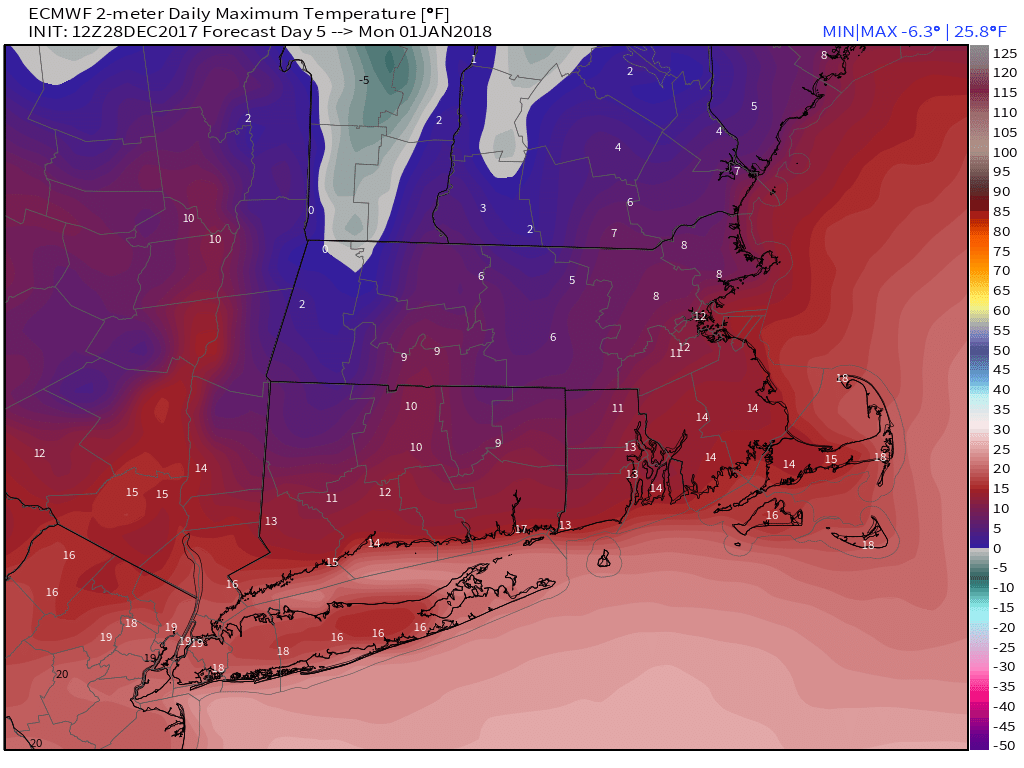 Very cold weather returns on Sunday and lasts through the New Year. It may be the second coldest NYE on record in Times Square, with temperatures in the 8-12° range at midnight. Wind chills will be below zero. It will be the same story in Providence and Boston. Highs will be in the teens on Monday, even with sunshine. It stays very cold and dry Tuesday and Wednesday.